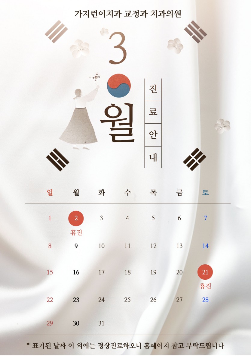 26년도 3월 휴진일 공지드립니다 페이지 정보 가지런이치과 26-02-26 13:58 view20 Comment0 관련링크 next → 목록 본문 표기된 날짜 이 외에는 정상진료하오니 홈페이지 진료시간안내 참고 부탁드립니다 댓글목록 등록된 댓글이 없습니다. next → 목록
